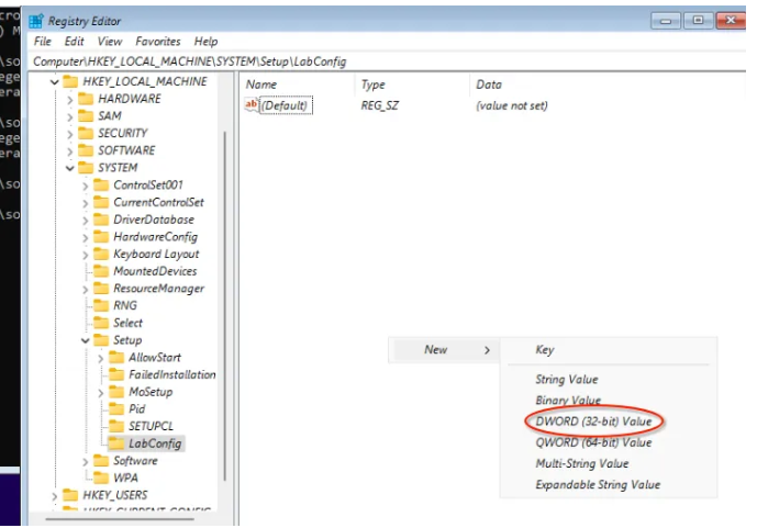 8.ในโฟลเดอร์ที่สร้างขึ้นมาใหม่นั้นให้คลิ๊กขวาและเลือก New -> DWORD (32-bit) Value และกำหนดชื่อว่า BypassTPMCheck
